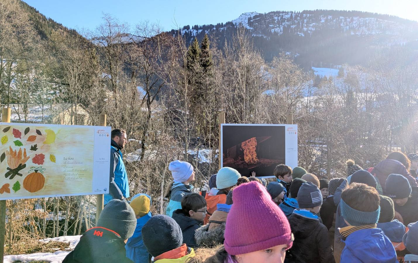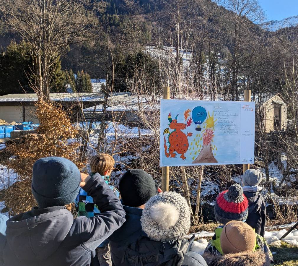 Elle est le résultat d’ateliers réalisés à l’école (décrits ici), qui permettront aux usagers – et ce pendant un an – de découvrir l’air, le feu, le vent et la terre sous la forme d’un cheminement dans Praz, parcourant les Belles, la route de l’Arly et la berge de l’Arly, sous le verger communal.
