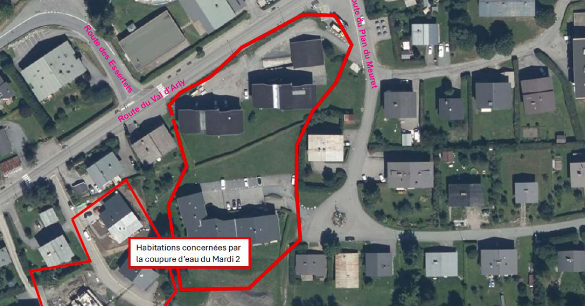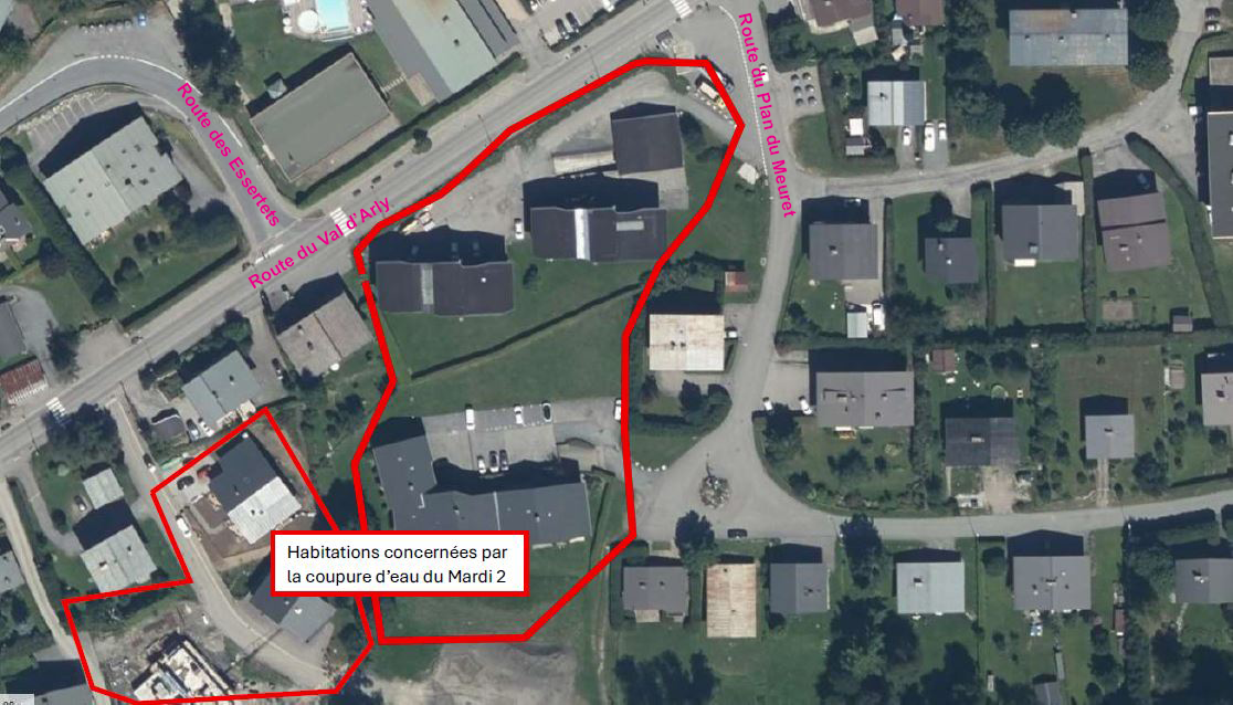 En raison de travaux, les habitations entourées en rouge sur le visuel seront concernées par une coupure d’eau le mardi 2 septembre, toute la journée. Nous invitons donc leurs occupants à prendre leurs dispositions concernant l’approvisionnement en eau et à éviter tout usage d’appareils électroménagers (lave-vaisselle, lave-linge…)