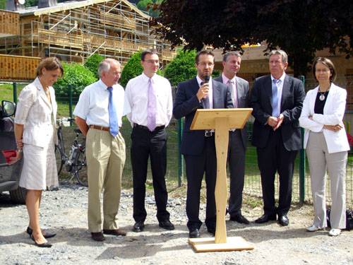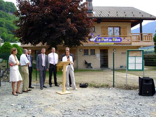 En photo, de gauche à droite : Pierre Bessy (1er adjoint au maire), Martial Saddier (député), Rémy Demersseman-Pradel (président de La Part de Rêve), Georges Morand (conseiller général et maire de Sallanches), Yann Jaccaz (maire de Praz-sur-Arly), Jean-Claude Carle (sénateur), Sylvie Gillet de Thorey (vice-président du Conseil Régional), Sylviane Grosset-Janin (maire de Megève) et Georges Basset (élu de Praz en charge des bâtiments communaux