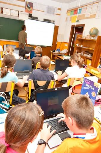 - 9 ordinateurs portables (8 pour les enfants et un pour l'enseignant) rangés dans une armoire de stockage et équipés d'un logiciel permettant de visualiser sur l'ordinateur portable de l'enseignant l'écran de chaque enfant.