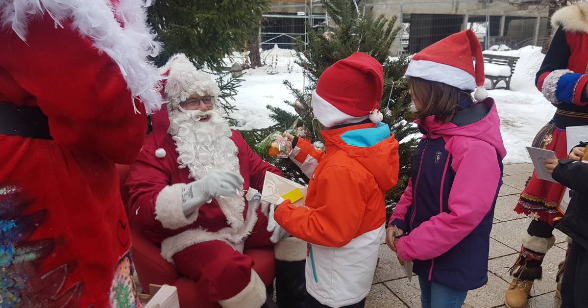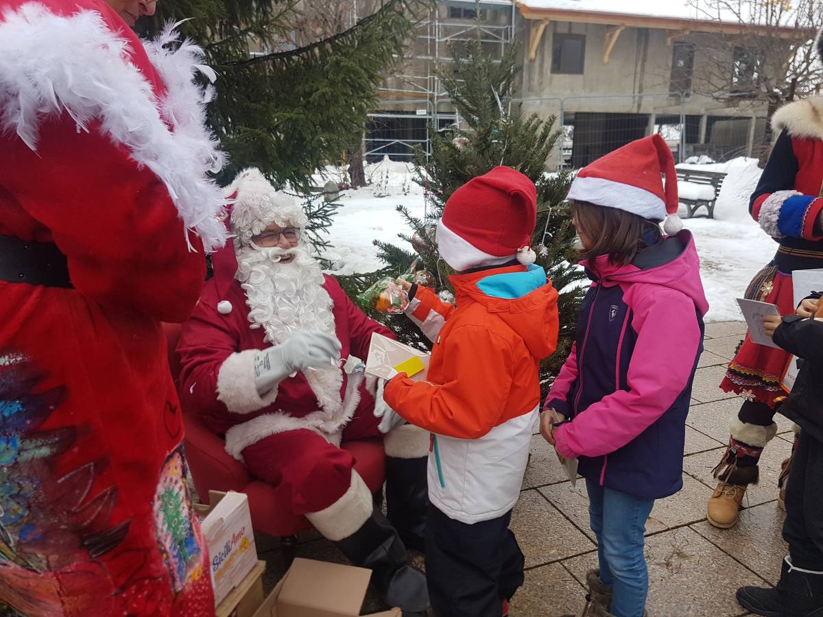 Ils ont ensuite appelé le Père Noël, qui est arrivé non pas sur son traîneau mais avec la Mère Noël et un lutin. D’abord impressionnés voire surpris, les enfants ont ensuite rejoint le Père Noël assis sur son fauteuil rouge, dont la « hotte » était remplie de gourmandises et de puzzles à colorier soi-même.