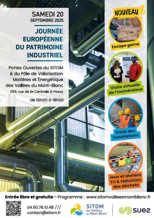 À l’occasion des Journées européennes du patrimoine, le Sitom des Vallées du Mont-Blanc et Suez ouvriront les portes du pôle de valorisation énergétique de Passy le samedi 20 septembre 2025 de 10 h à 18 h. Ils feront découvrir aux habitants du territoire le parcours et les solutions mises en œuvre pour valoriser les déchets.