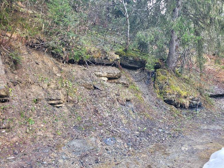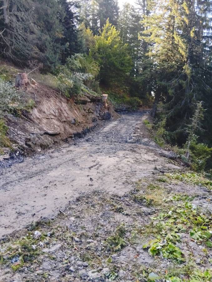 Étant donné la stabilité du talus amont, composé d'imposantes dalles schisteuses, et le glissement de terrain sur une longueur d'une dizaine de mètres touchant le talus aval, Dumas Frères est intervenue fin septembre pour élargir la piste d’environ 2 m du côté « amont » et ainsi éloigner la bande de roulement des tracteurs forestiers de la zone en surplomb.