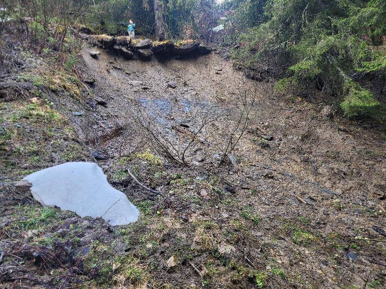 Au cours des travaux, l’entreprise a donc abattu 4 arbres résineux, dessouché et reprofilé le talus amont en terrassant et en évacuant un volume important de matériaux. Elle a par ailleurs réalisé un fossé au pied du talus amont ainsi que des renvois d’eau pour assurer l'évacuation des eaux de ruissellement en dehors de la zone en glissement.