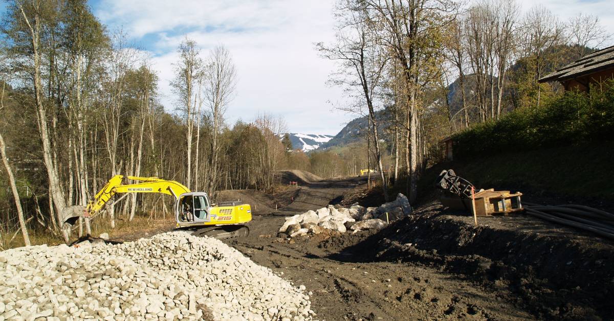 Vue côté parking des pistes où a lieu le busage de la traversée du ruisseau du Berrier, une des parties les plus délicates avec l'enrochement qui se déroule de l'autre côté du chantier.