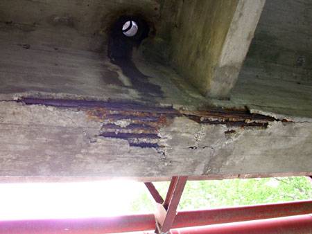 La pathologie résulte d’un défaut de conception bénin mais qui a évolué de manière exponentielle. En 2005, la DDE avait signalé dans un rapport, avec photos à l’appui, quelques zones où les aciers du ferraillage des poutres maitresses étaient apparents. La cause provenait du ruissellement des eaux de drainage du tablier sur celles-ci. Depuis, de l’eau est passé sous le pont et en automne 2010, les zones concernées avaient pris des proportions inquiétantes. Elles se sont largement étendues et les ferraillages étaient fortement corrodés probablement en raison du sel de déneigement.