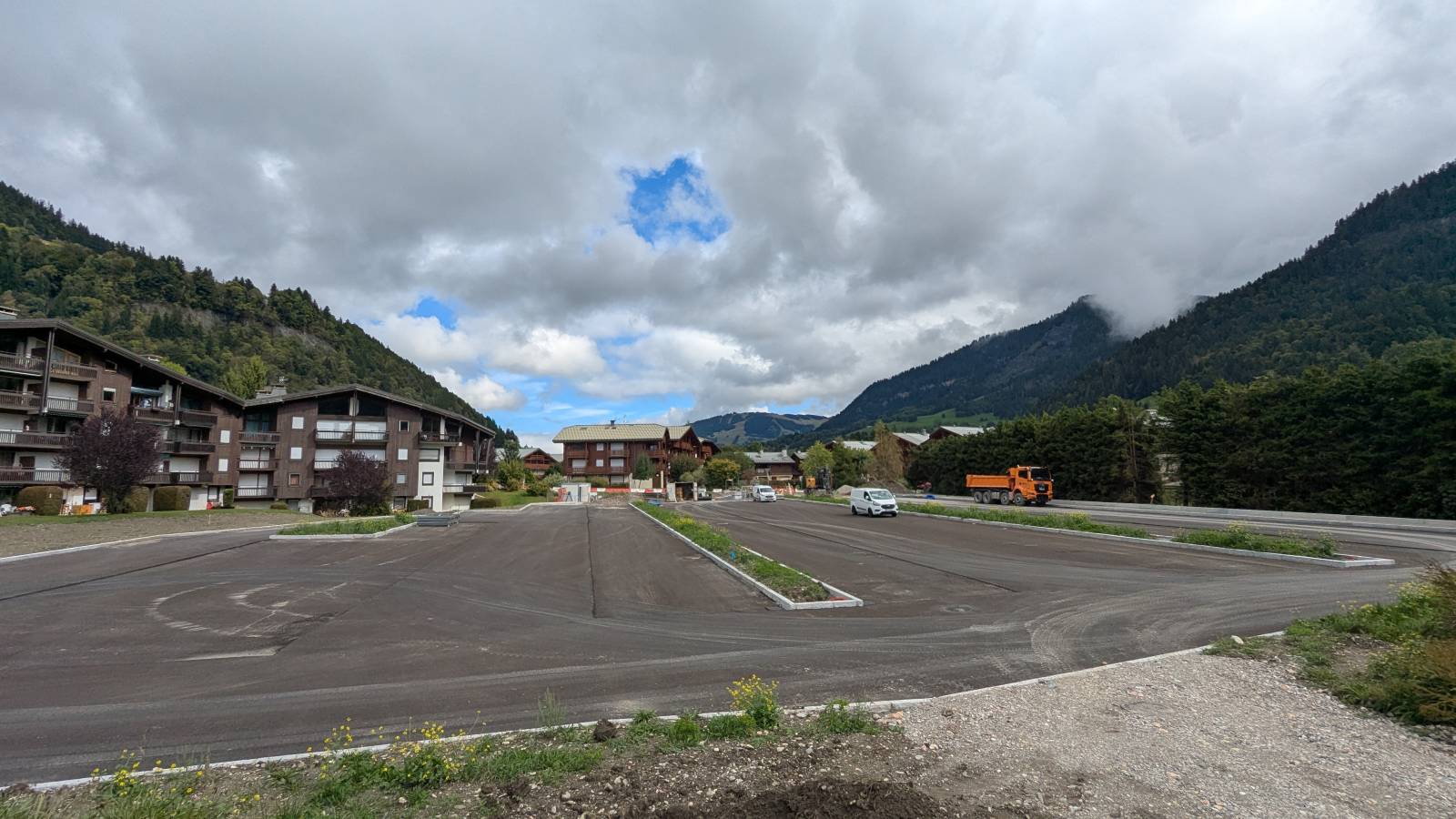 Aménagement d’un parking central et gratuit de 157 places, avec toilettes à nettoyage automatique. Ses principaux rôles sont de répondre aux besoins en stationnement du plan d'eau et de la base de loisirs des Belles (en lieu et place du champ aux Belles qui servait provisoirement de « parking »), ainsi que du centre village pour le stationnement de longue durée. Le parking a été intégré dans le parcours des navettes gratuites estivales et hivernales, et il proposera – à l’avenir – deux places dédiées à la recharge électrique et des arceaux à vélos.