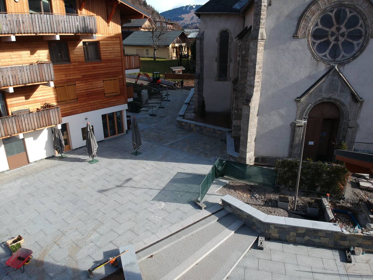 Finition des voies piétonnes entourant l'église, du parvis ouest et aménagement d'une bonne partie de la place de l'église. Les travaux vont se poursuivre en 2026.